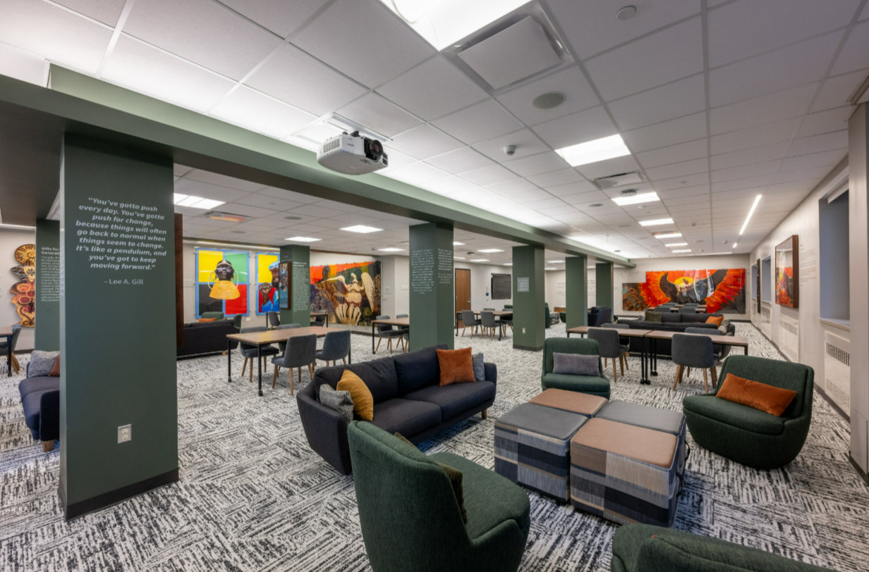 Interior view of Ambatana, the Afro-American Multicultural Lounge at the University of Michigan’s South Quad, highlighting the 2024 award-winning renovation and a painting honoring Lee A. Gill.
